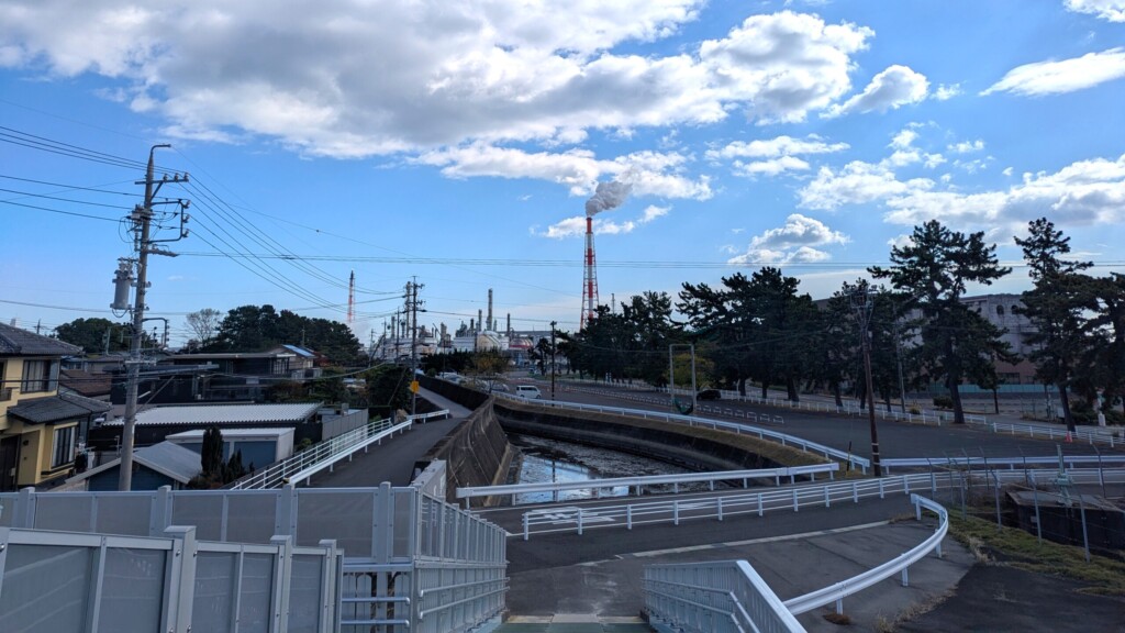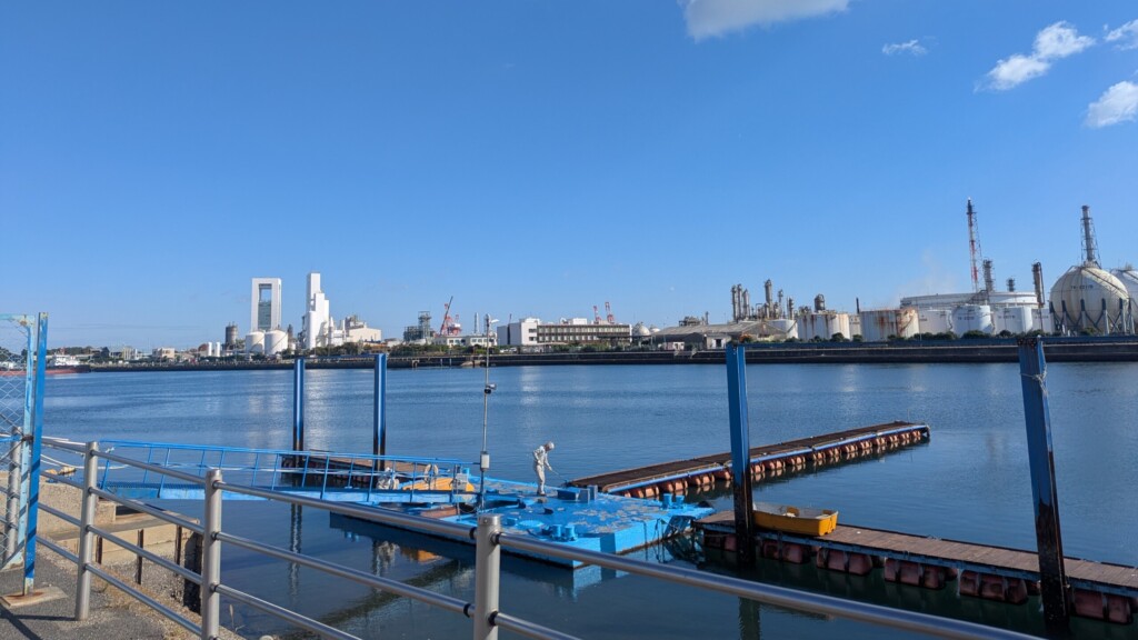 夜のライトアップだけでなく、昼間の工場風景も迫力があります。晴れた日の青空と工場の無機質な構造が対比となり、写真映えするポイントとしても人気です。