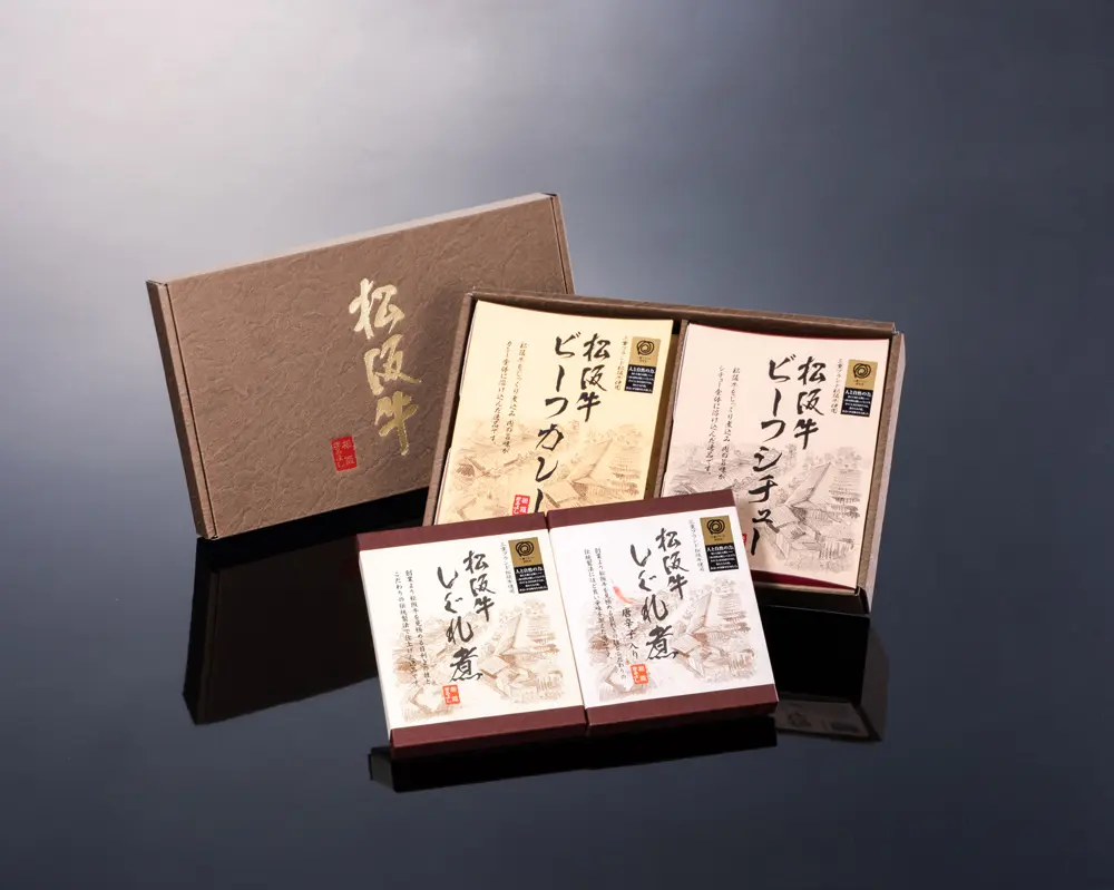 • ビーフシチュー、ビーフカレー、牛しぐれ煮など、松阪牛を多角的に味わえる贅沢セット。